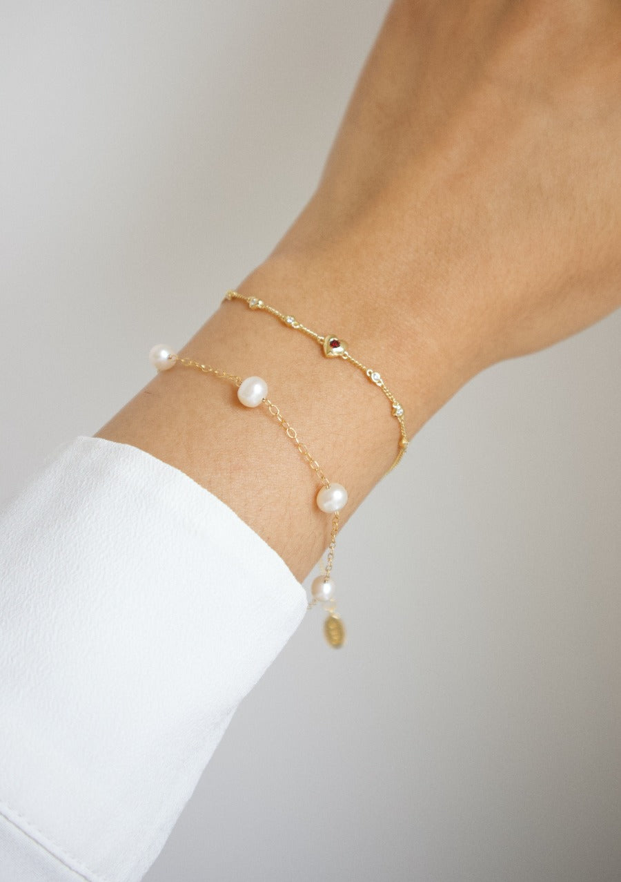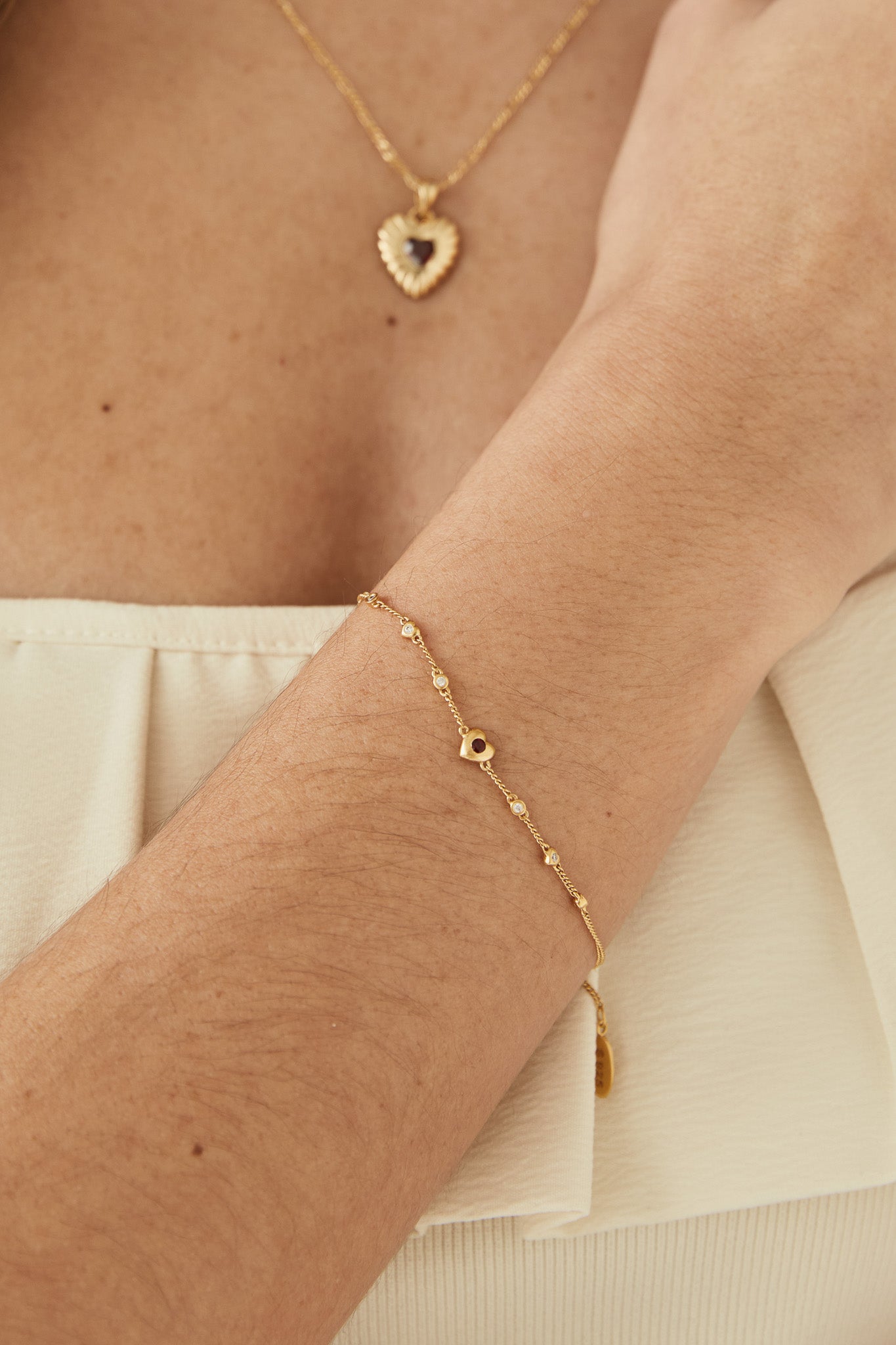 The Fearless Heart Bracelet pairs beautifully with the Fearless Heart Satellite Choker. Designed and hand-crafted to shine on your wrist, it features natural garnet stones and delicate heart-shaped connectors.