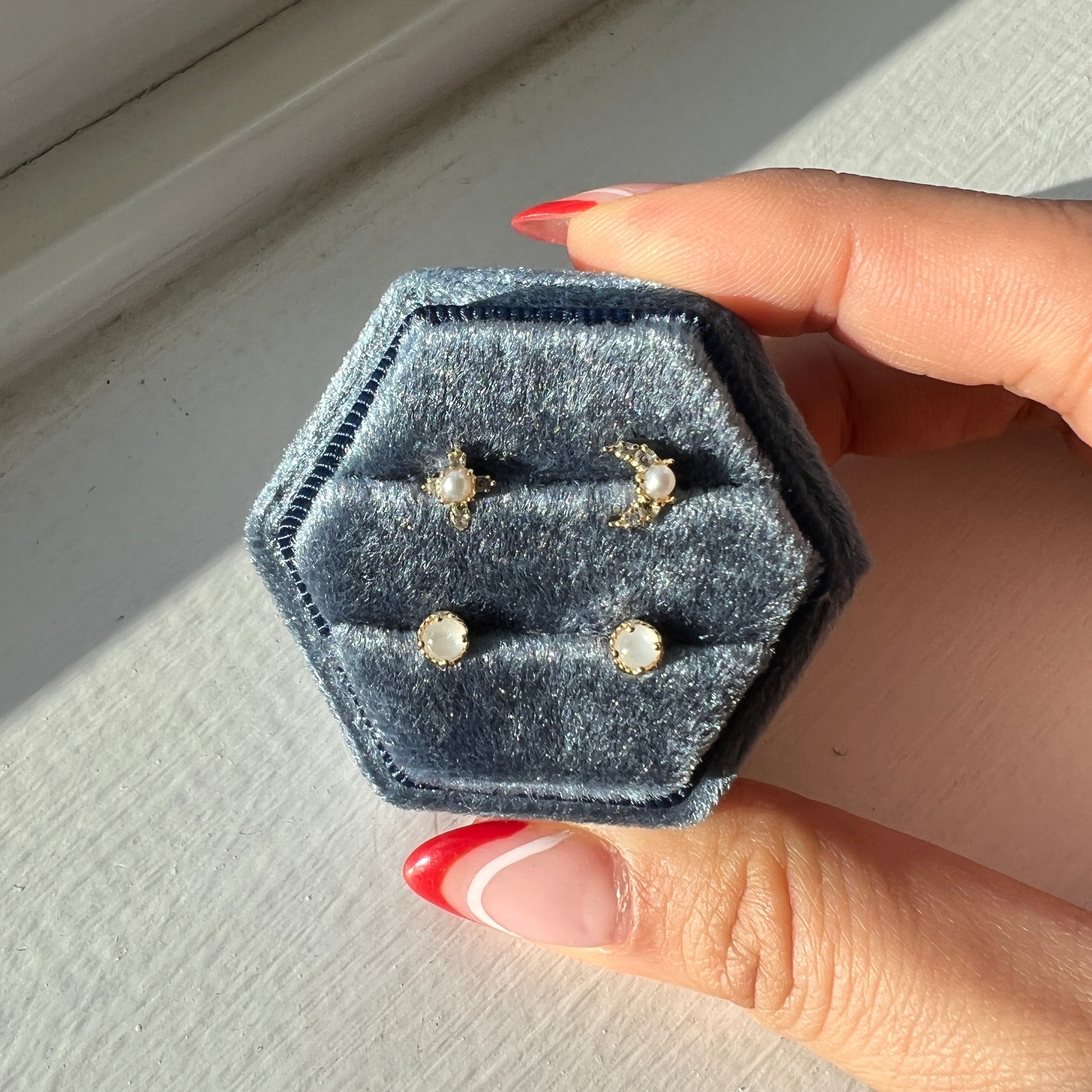 The Moonstone stud earrings are a pair of earrings that features 3mm genuine moonstones.