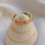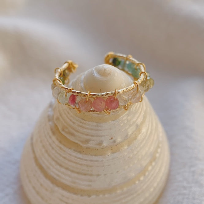 This Astrid Rainbow Ring is made with tourmaline beads from pink, orange, yellow, green, dark blue and light purple. The lustre of the ring will brighten up your day immediately and it definitely would be a convo starter on a night out!