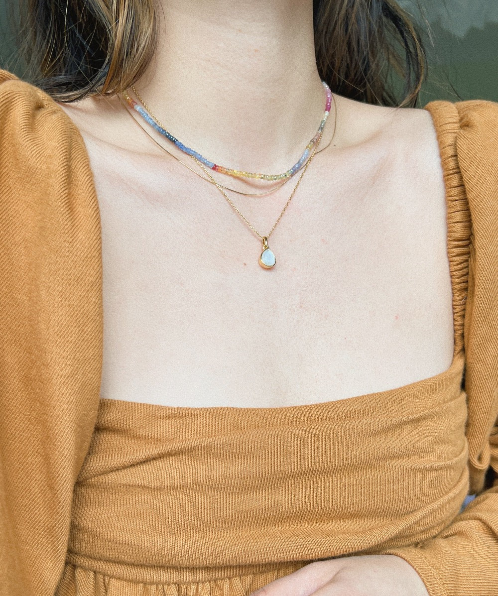 Prism is a multi-color sapphire necklace that captures the vibrant colors and energy of spring. The different shades of blue, pink, yellow, and green evoke the blooming of flowers, blue skies, and fresh greenery.
