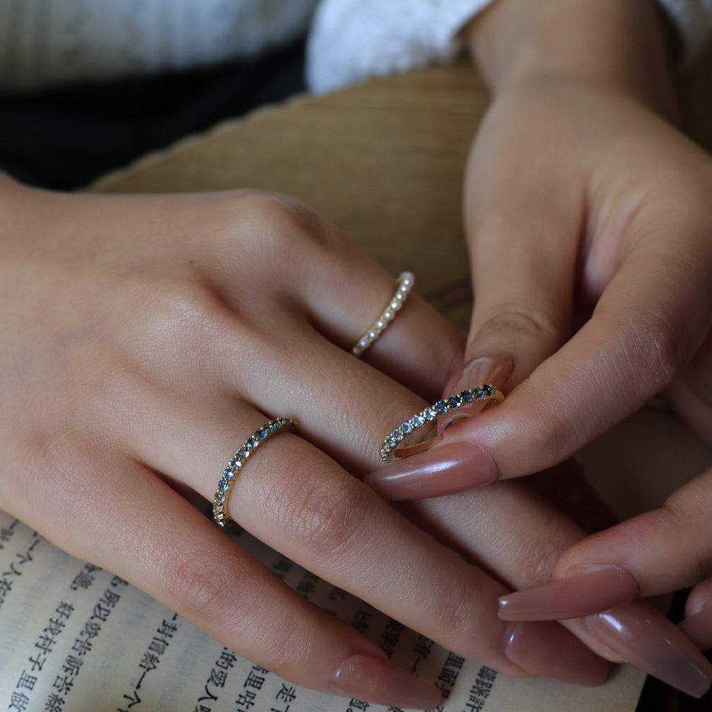 Adorn your hand with the enchanting beauty of this gradient blue topaz pave ring. Meticulously crafted from sterling silver with a lavish 14K gold plating, this ring boasts a seamless line of sparkling blue topaz stones, meticulously arranged to create a stunning gradient effect. The absence of a centerpiece stone enhances its modern allure, making it an ideal choice for stacking. Elevate your style with this exquisite pave ring, a harmonious blend of contemporary design and timeless elegance.