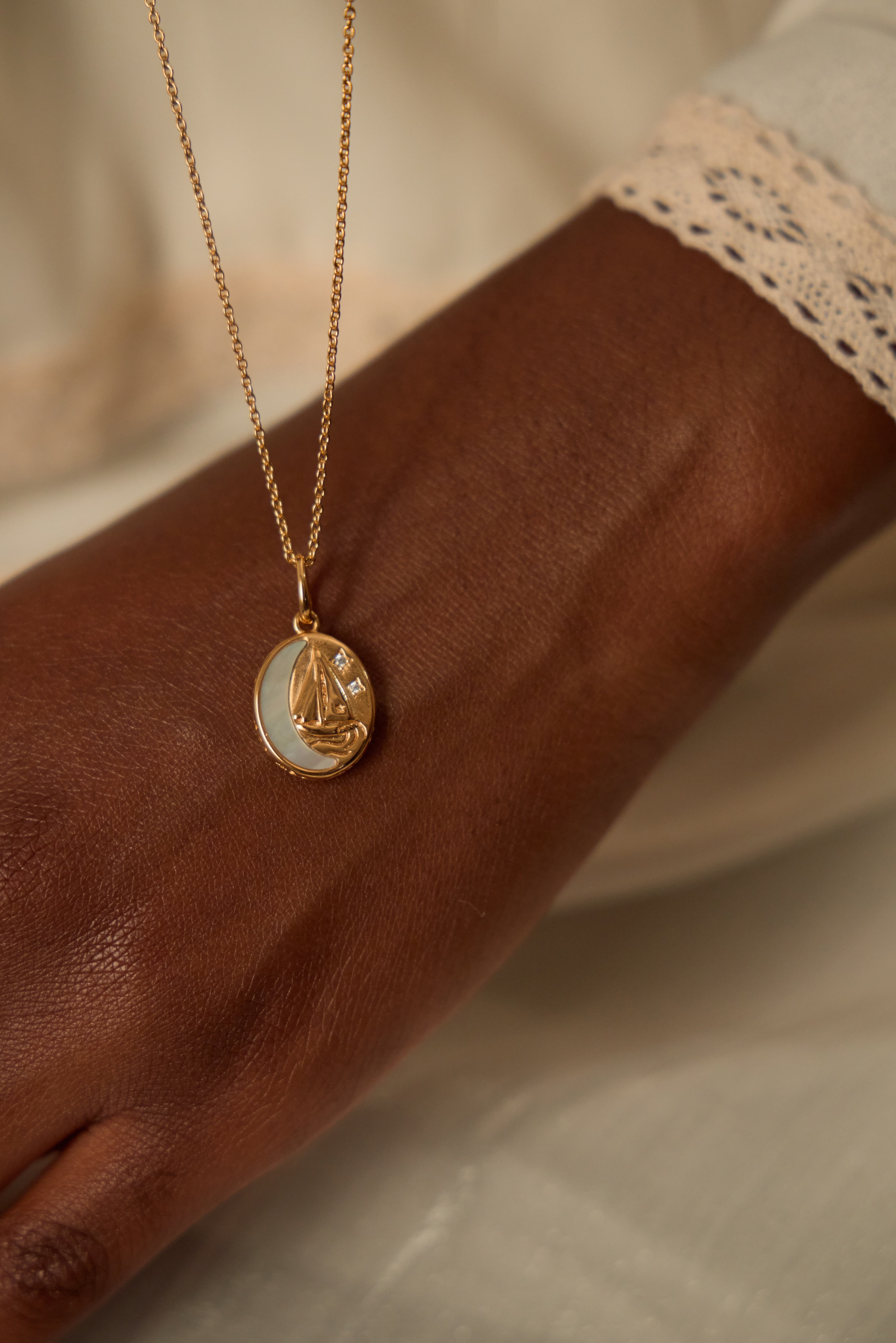 At its centre rests a luminous moon made of mother-of-pearl, reflecting gently over peaceful seas. A small boat sails quietly beneath it, while delicate, shining stars lead the way forward with trust and calm.