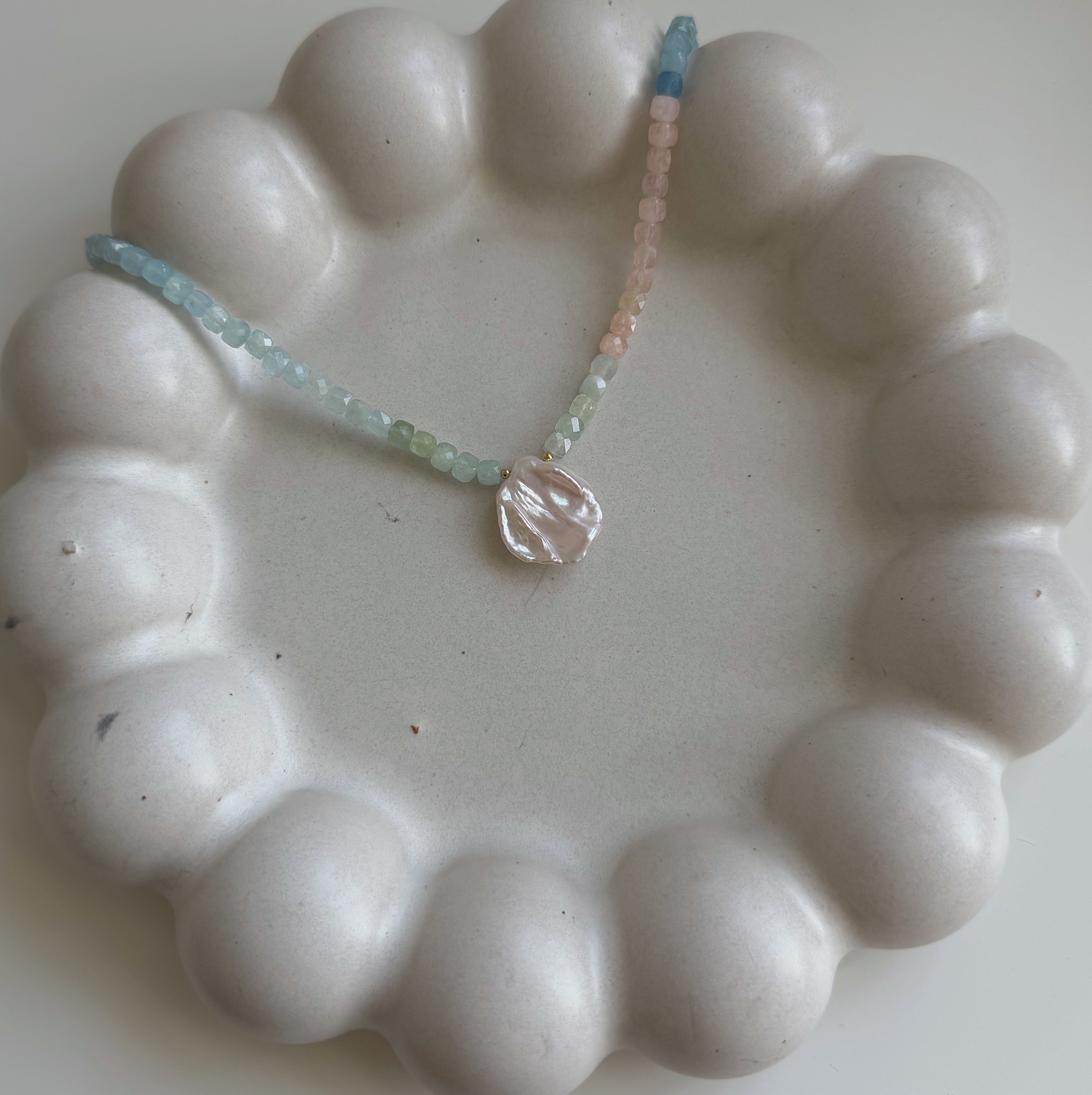 - Material: Aquamarine beads, morganite beads, freshwater pearls, 14K gold-filled clasp