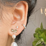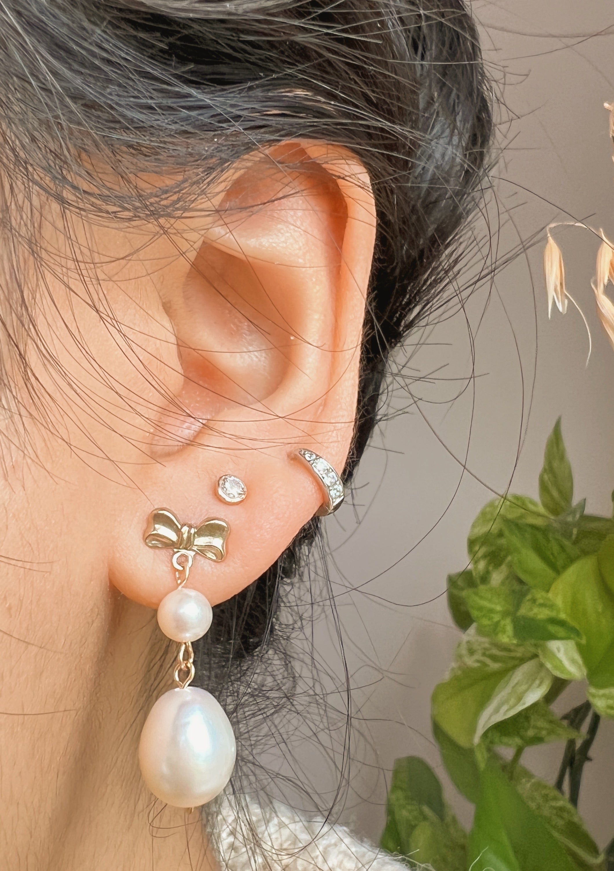 Just another pair to be added to your pearl earring collection! This pair of Bow pearl drop earrings speak a romantic, elegant and ethereal vibe. The earrings are handmade with lustrous freshwater pearls for a romantic appeal.
