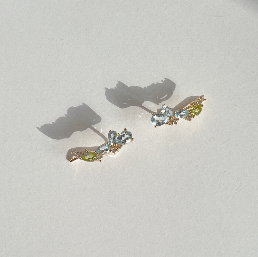 Step into spring with confidence and style with our gemstone climber earrings. Crafted with peridot, sky blue topaz, and white quartz stones, these earrings are more than just an accessory - they are a celebration of your unique spirit and beauty.