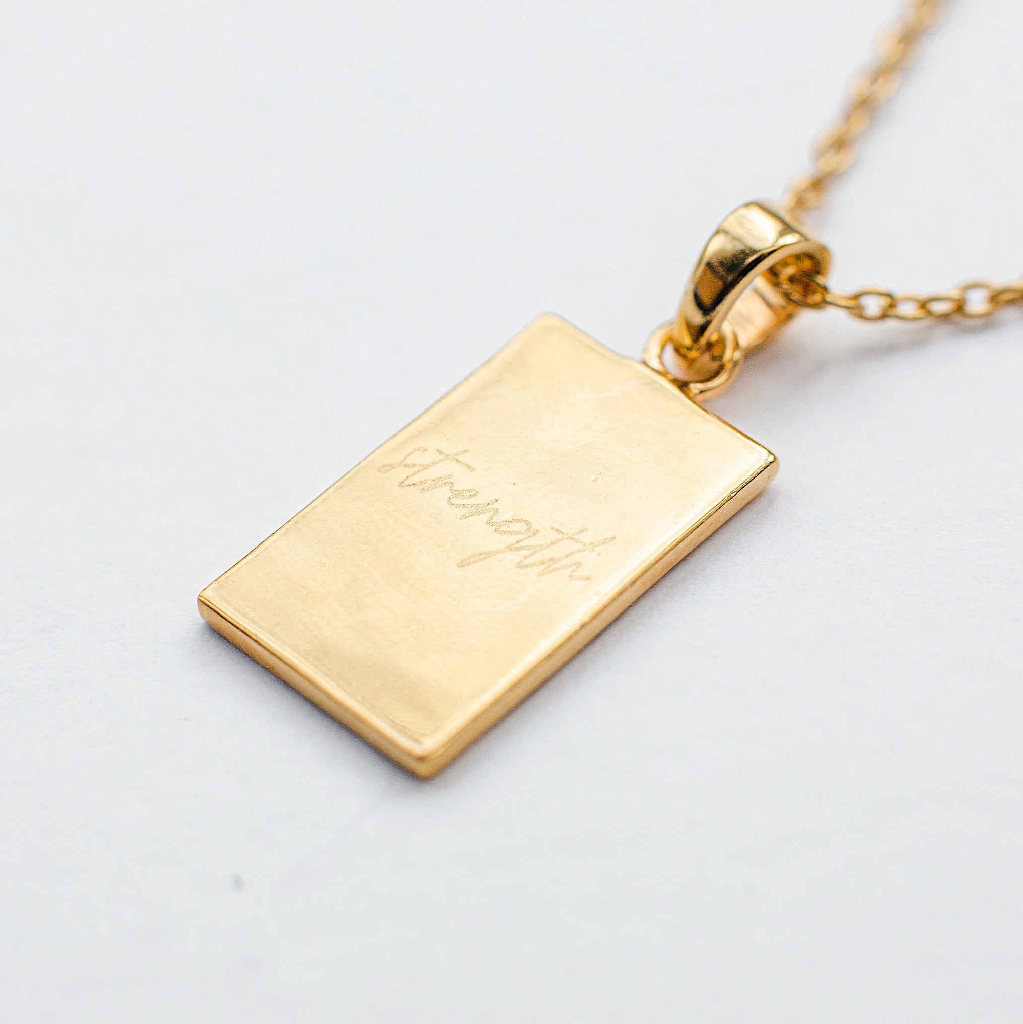 Handcrafted in 18ct gold plated recycled silver, features an engraved lion with an infinite sign, and two sparkly stars above. On the back of the pendant, the word Strength is engraved.