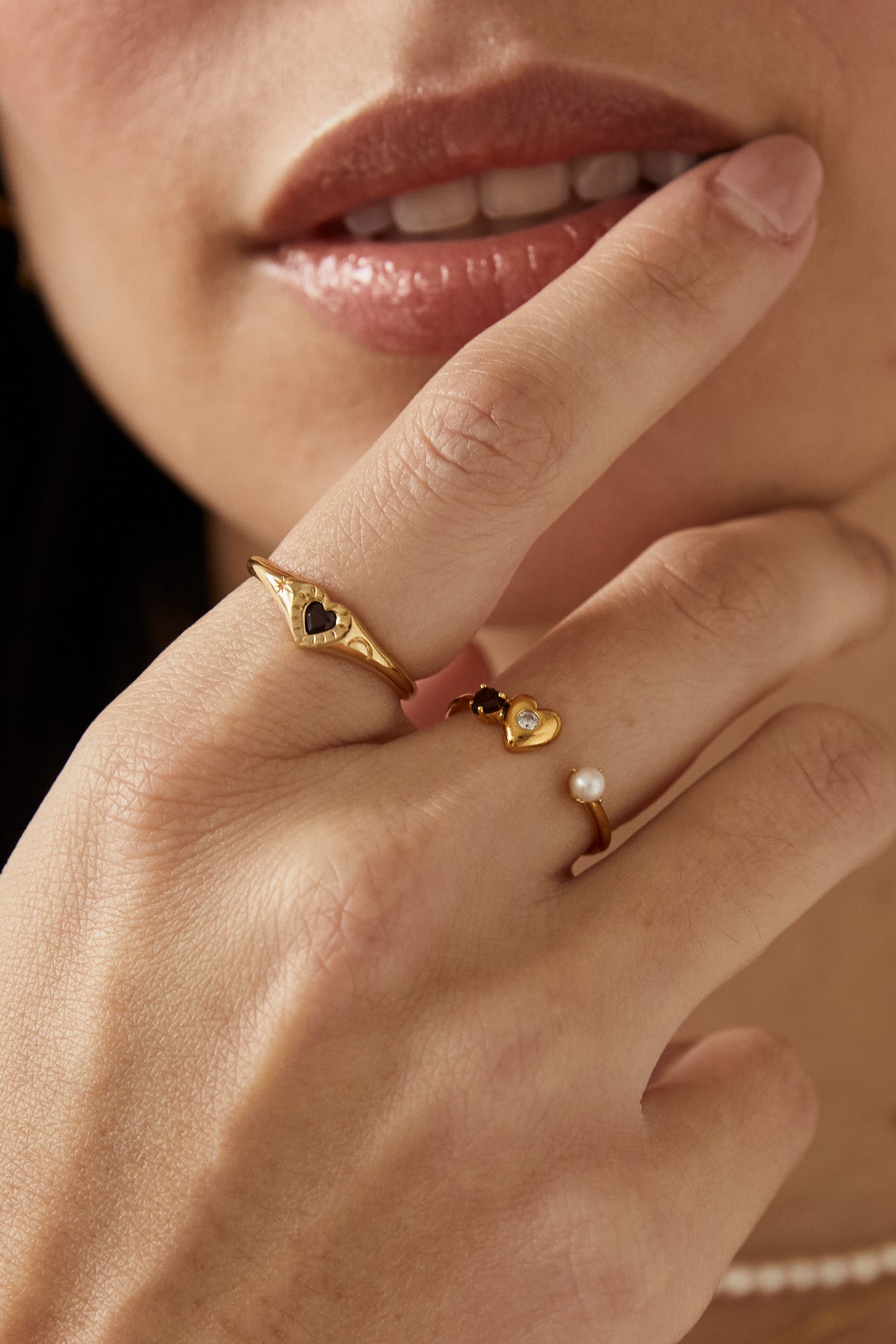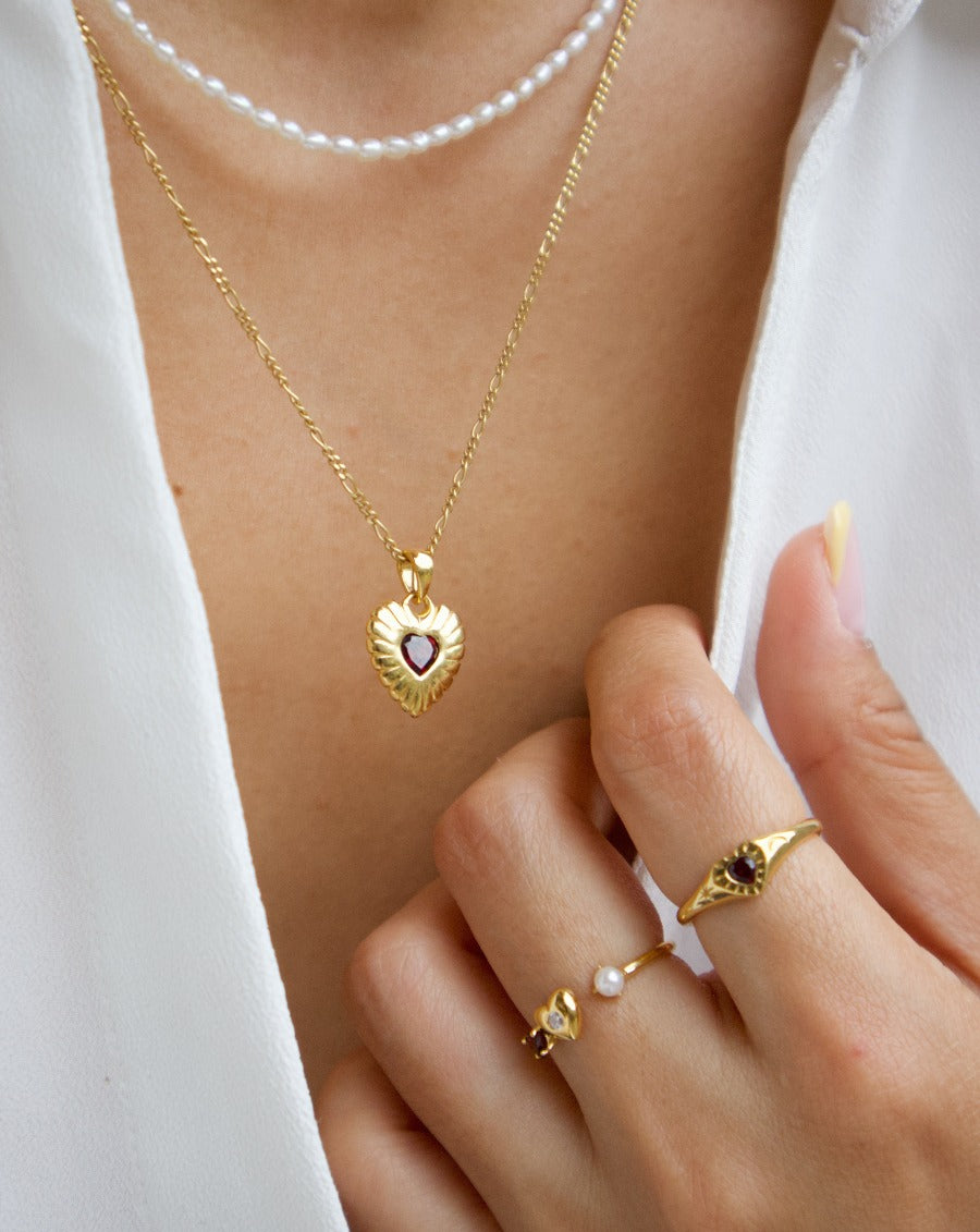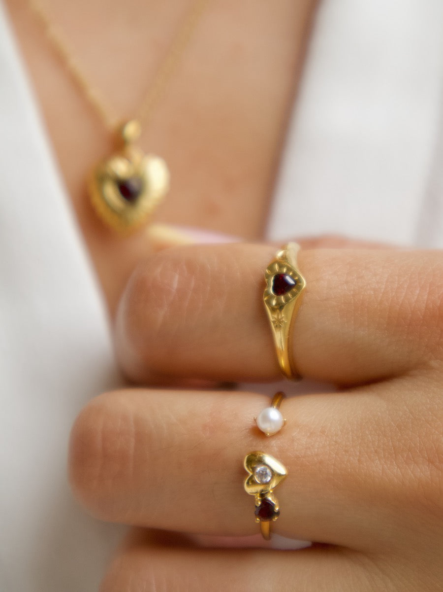 This ring is a part of our Fearless Heart Collection. It's a dainty ring that can be worn alone or stacked with other rings, perfect for your everyday life! We embedded elements of love (garnet) and nature (pearl) into this lovely and versatile ring design.