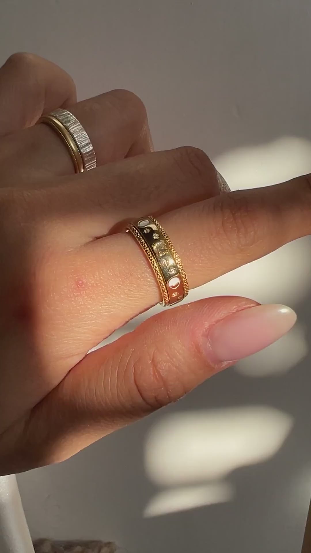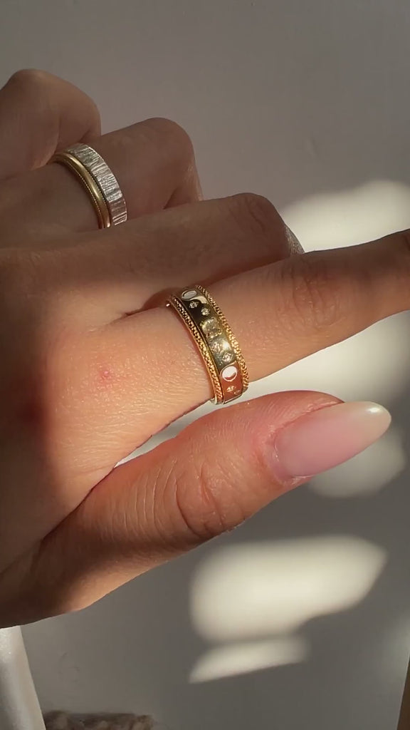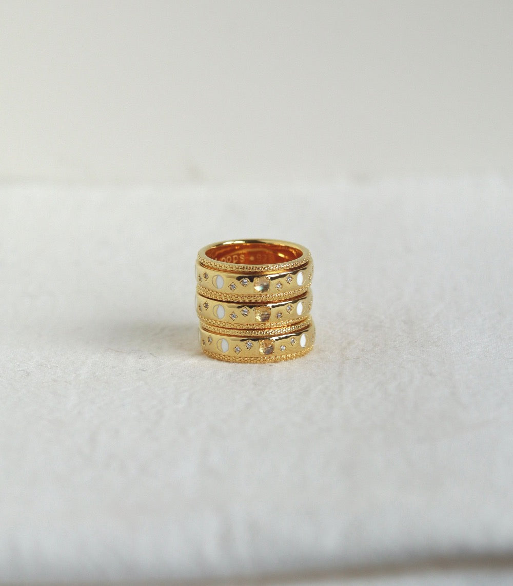 Each delicate lunar phase is meticulously crafted with vibrant enamel, capturing the mesmerising progression of the moon's cycle, and featuring a natural moonstone delicately to represent the full moon's luminous presence, this ring embodies the essence of change and renewal.